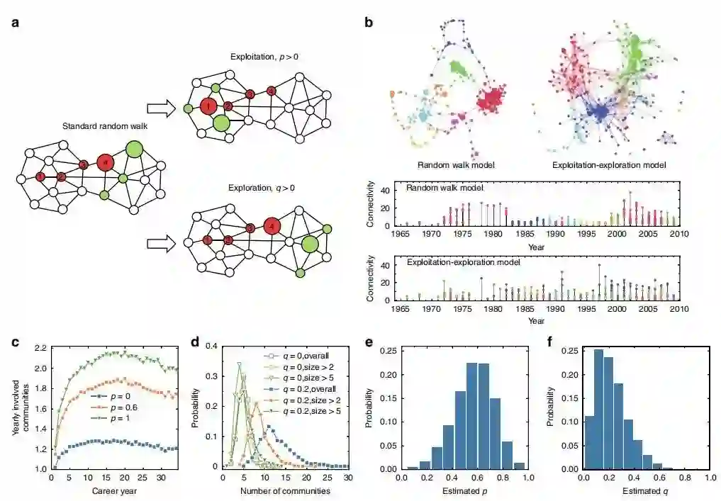 关于RWM模型和EEM模型的说明性演示,如图5a所示。图中的底层的网络是表示全部的知识空间,红色节点是科学家已经激活的节点,数字记录了节点被激活的步骤。节点激活过程的最简单模型是标准随机游动,假设科学家随机激活最后激活节点的相邻节点。因此,在图5a的左图中,红色节点4的一个相邻节点(用较大的绿色标记)将被随机地拾取和激活。但在EEM中,文章引入了一个开发过程和一个探索过程。利用概率P,科学家随机地重新开发一个先前激活的节点的邻域。在图中,科学家通过跳回到红色节点1并随机激活它的一个邻域进行开发。在概率Q下,科学家随机探索节点4的最近邻居以外的节点。为了简单起见,文章假设科学家在探索步骤中随机激活下一个最近的邻居。
