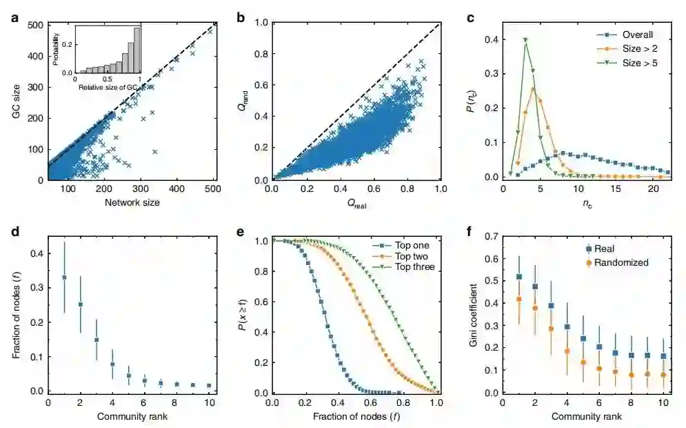 对网络中几个最大社团中节点分数的反向累积概率进行深入研究,可以发现,对于一半的科学家来说,三个最大的社团包含了超过70%的论文,如图2e所示。
