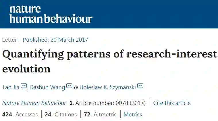 《Increasing trend of scientists to switch between topics》主要在科学家个人职业生涯中短期(逐篇文章)的尺度下,研究科学家兴趣转移的微观动力学问题。
