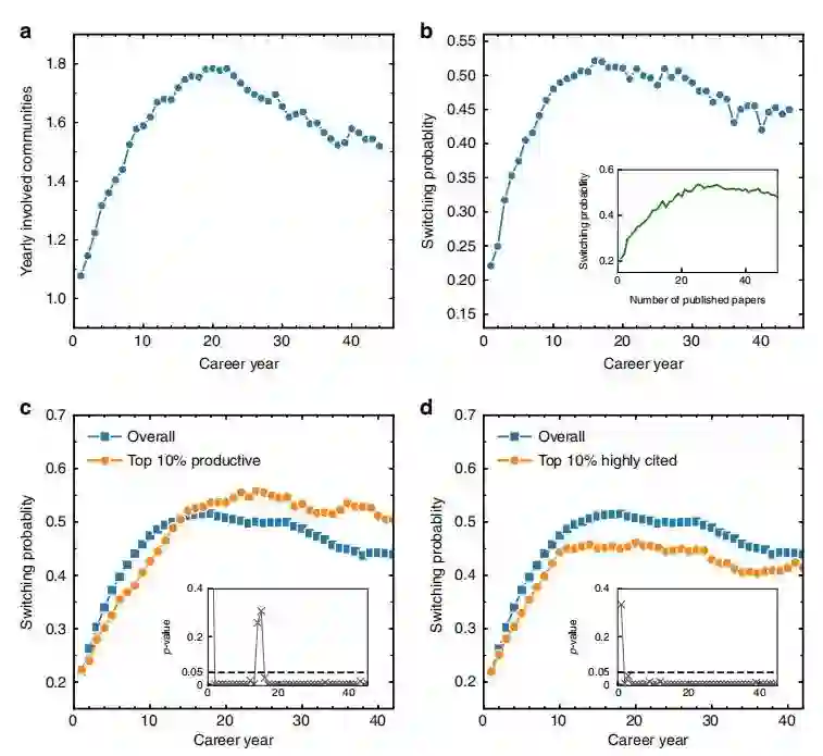 此外,文章在图3d中比较了论文平均引用率最高的10%的科学家的转换概率和全部科学家的转换概率。如图所示,在所有科学家职业生涯中,论文的高平均引用率与低转换概率相关。这一有趣的发现可能是因为较高的转换概率降低了在某一特定领域专家的印象,从而导致了较少的引用率。进一步,文章对转换概率进行了Kolmogorov–Smirnov检验。图3c与图3d的插图中所示的小P值大多数小于0.05。