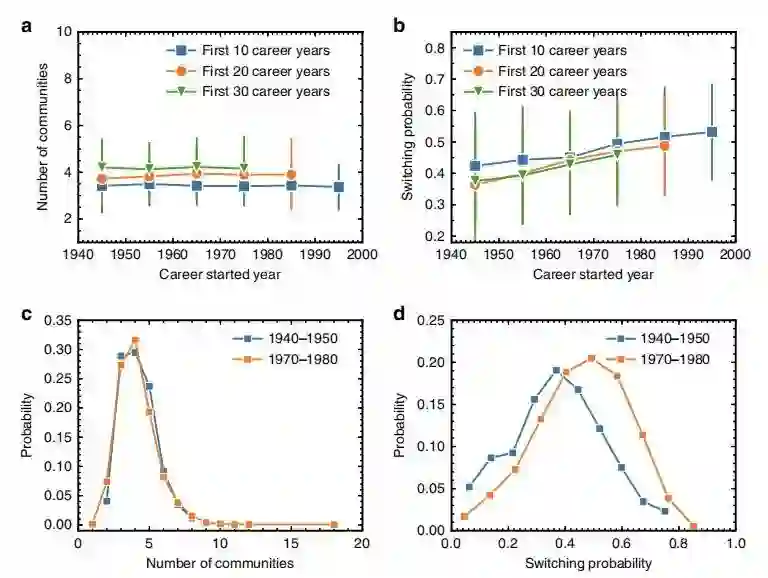 文章进一步计算了每个科学家在其职业生涯中的平均转换概率,并相应地通过平均每年开始其职业生涯的所有科学家的转换概率来计算每年的平均转换概率。图4b中的结果表明,尽管多年来社团的数量是稳定的,但从上个世纪开始,科学家在社团(主题)之间的转换越来越频繁。更具体地说,早期的科学家倾向于在转换到另一个话题之前在一个话题上工作更长的时间。相反,现在的科学家倾向于在多个社团中同时出现,导致社团之间的转换更加频繁。图4b中的误差线表示标准偏差。图4a、b中的大误差条是由于科学家在转换概率上的不均匀性造成的。