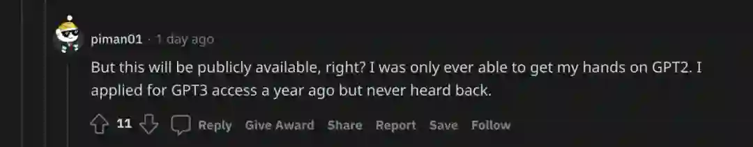 有人表示,自己曾在一年前申请了 GPT-3 的访问权限,但从未收到回复。在 GPT-NeoX-20B 项目中,这样的情况显然不会发生。