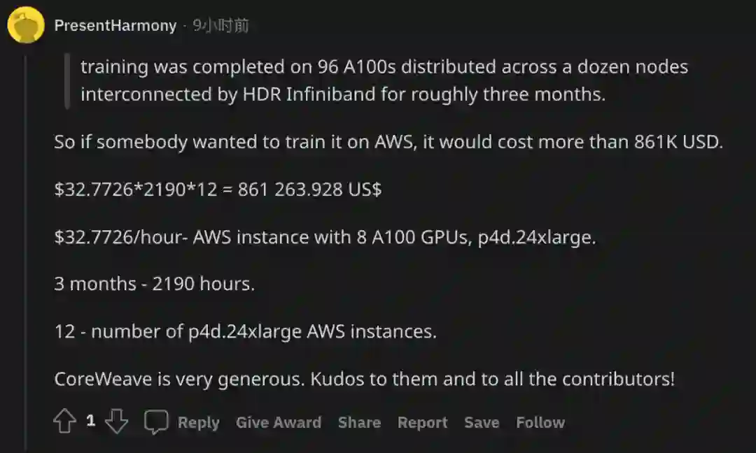 有人根据 AWS 的收费标准粗略地计算了一下训练过程所需要的成本,大概有 86 万美元: