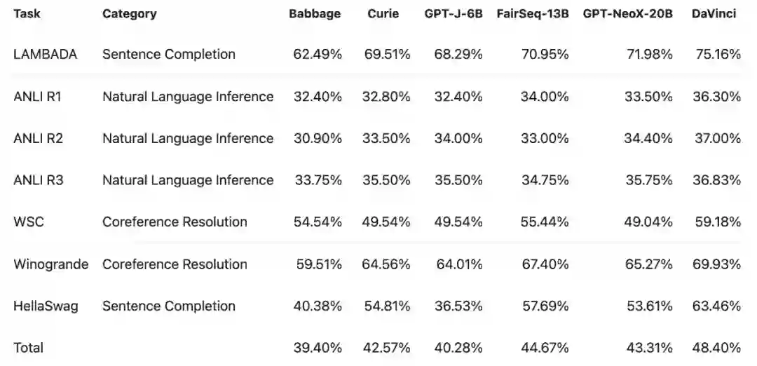 研究者首先在 LAMBADA 等多项标准任务上对比了 GPT-NeoX-20B 与 Babbage、Curie、DaVinci 这些 OpenAI 商业 API 以及 GPT-J-6B 等模型的表现。