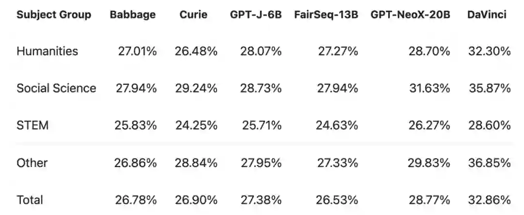 根据 HendrycksTest 评估,各模型对不同学科组事实知识的准确性测量对比。
