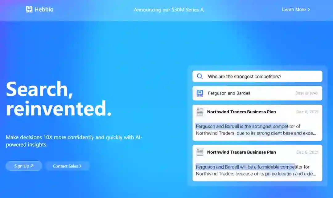 Hebbia由George Sivulka于2020年成立,其开发的“神经”搜索引擎能通过检索PDF、PPT、Excel等数亿份文档内容,为用户提供所需信息。目前已有20多家企业成为Hebbia的客户,其中包括世界最大的私募股权公司、对冲基金、咨询公司等。