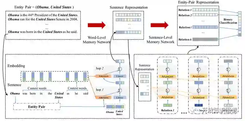 本文提出的模型包括两个基于注意力的记忆神经网络,第一个是单词级别的记忆网络,用于句子中不同单词的权重学习,每个单词的权重与两个实体有关;第二个是关系级别的基于注意力的记忆神经网络,用于学习不同句子实例的权重和关系间的依存关系。