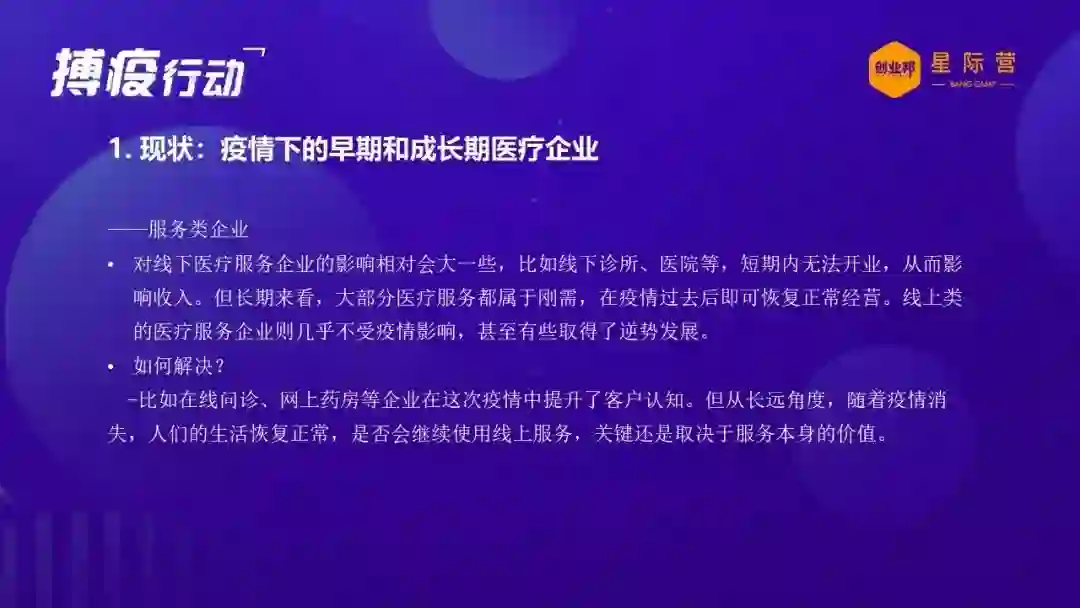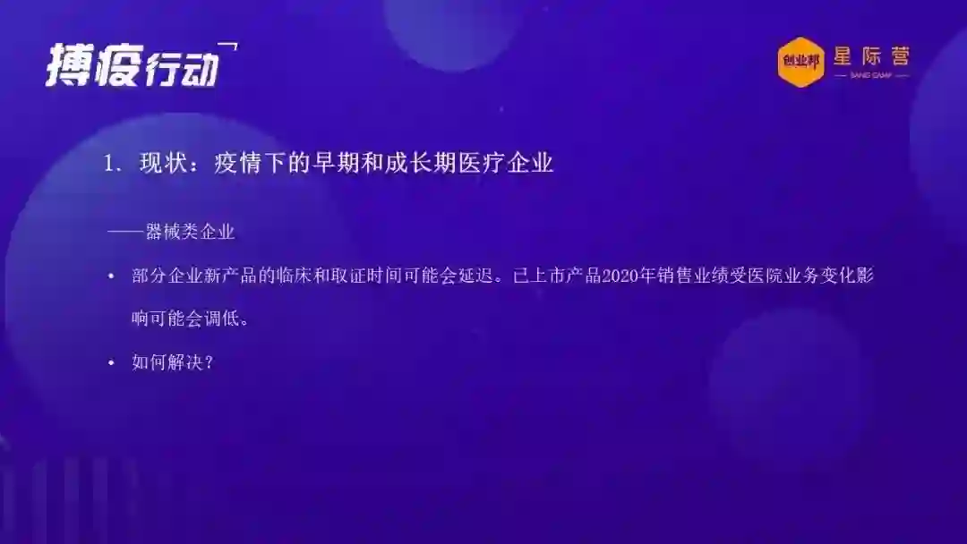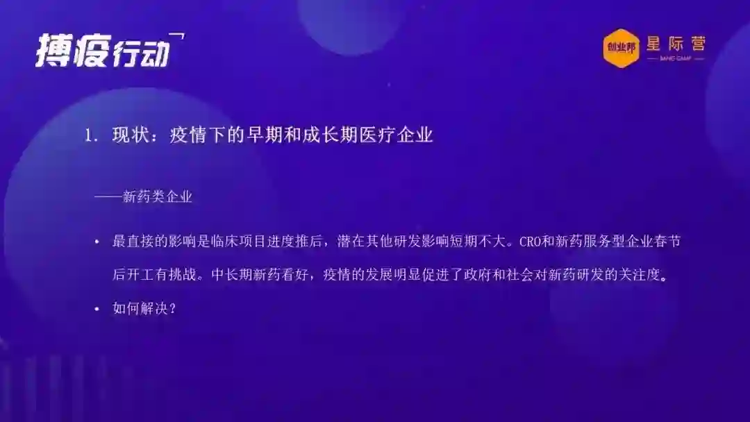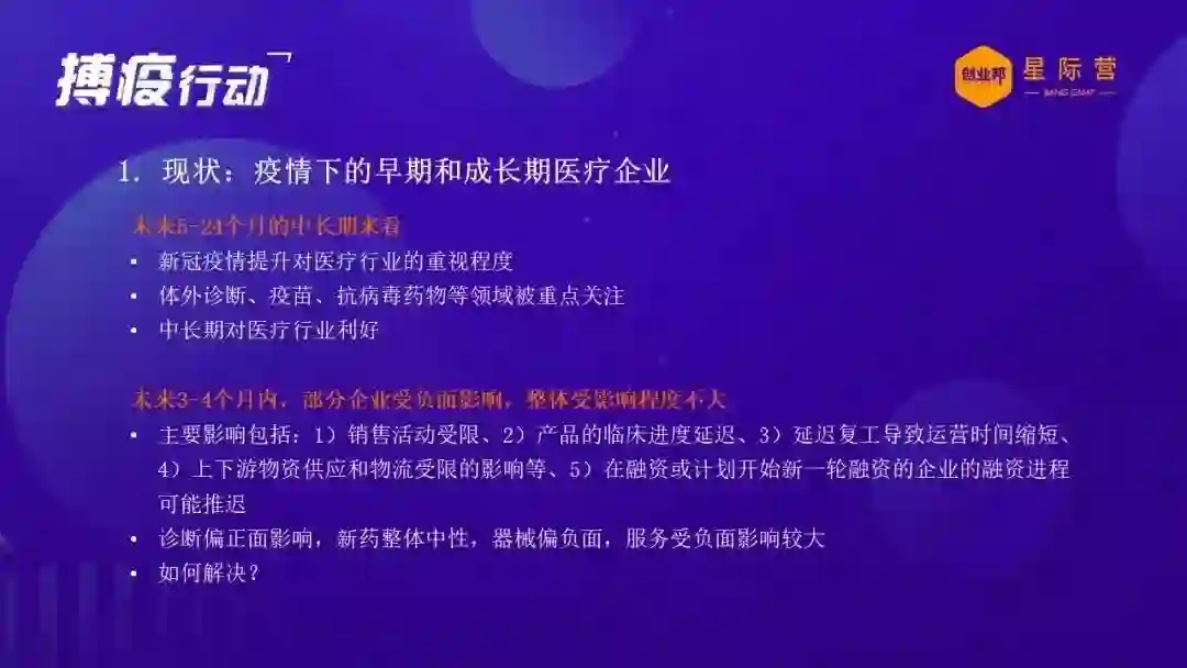 所以我觉得我们很多医疗医药的创业企业可以坚定在这方面的信心,继续在这个里面做好我们该做的事情,投资机构也会继续在这里面长期的耕耘。那么可能非医疗医药的创业企业,我个人觉得可能现在要转型做医疗医药创业企业有难度,但是可能刚才提到的一些医疗医药企业的一些把握机会的方向,或者去应付危机的一些措施手段,可能也对你们也是有帮助的,可以从长远的角度来考虑。