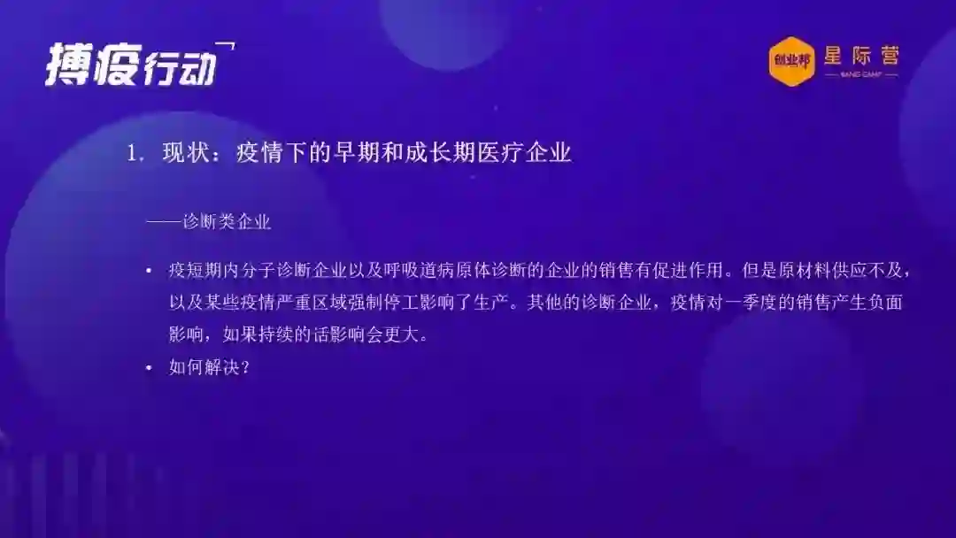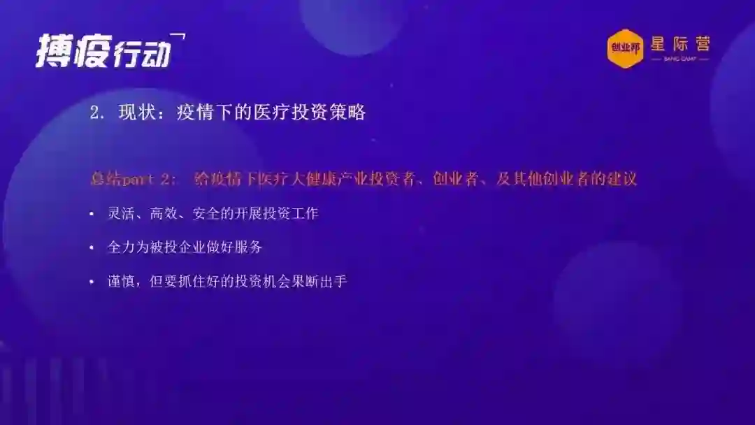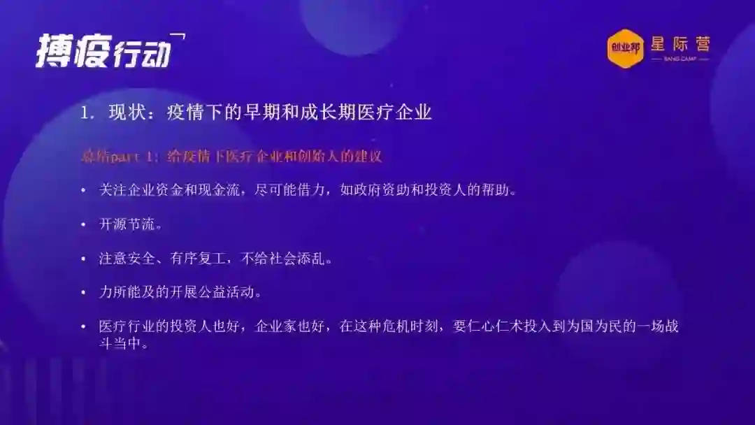 再讲一下在这个疫情下面,目前来说我们的这些企业怎么样来应付?中小企业,不管是创业企业,还是我们的投资机构,首先对我们的创业企业,包括我可能主要针对的是医疗医药的创业企业,我觉得目前的要做的工作主要是以下几个建议。