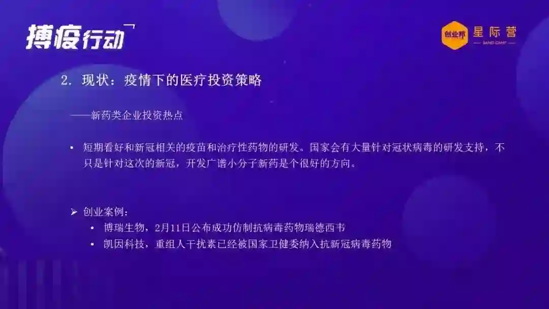 那么除了疫苗之外,抗病毒的药物和其他的一些这方面的药物,我相信也是会引起投资界的重视。创业企业也可以根据自己的能力来进行一些考虑和调整,因为坦白说我们在之前也是看到中国的创业医疗医药的药物、新药研发的创业企业也是高度的集中在肿瘤这个领域。现在也这个疫情也让我们打开了思路,可以来根据这次总结或者说看到的一些机会来进行长远的一个考虑。