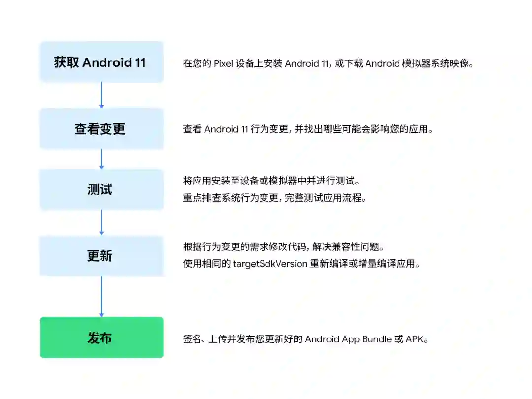 最大限度地降低行为变更影响: 我们的目标始终如一,即在您将应用的 targetSdkVersion 设置为 Android 11 之前,尽可能将这些变更设置为可选项,最大程度减少平台变更对应用带来的影响。如果您通过 Google Play 分发应用,则将有一年以上的时间逐渐适用这些变更。