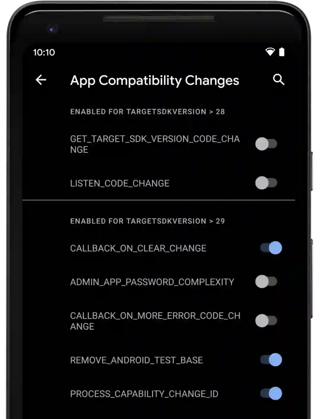 更轻松的测试和调试: 为了帮助您测试兼容性,我们将许多非兼容性变更设置为 "可关闭"。这意味着,您可以通过开发者选项或 adb 强制启用或禁用每一项更改。这样就无需为了一些基本测试而更改 targetSdkVersion 或重新编译您的应用。我们也简化了 Android Studio 自动化测试的流程。访问官方文档查看详细信息。