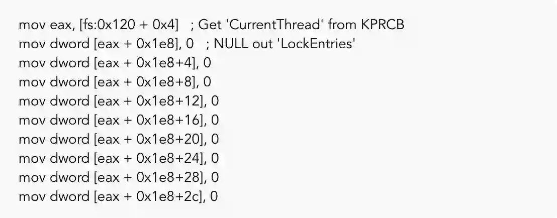 这是由于我们的方法只是跳过内核释放锁获取的过程。为了让我们退出syscall,我们需要更新shellcode,通过将我们的线程值清零来从线程中删除锁定:
