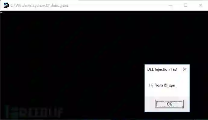 4.最后,使用CreateRemoteThread生成一个线程并在远程进程中执行LoadLibrary调用,将复制的DLL路径地址作为参数传递。