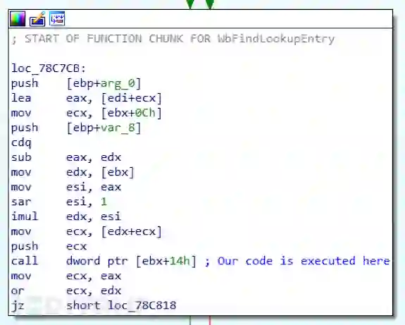 如果我们反汇编shellcode之前的最后一个函数WbFindLookupEntry,就可以找到调用shellcode的位置: