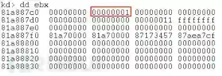 我们在这里找的是在偏移4h(或KPCR开始的124h)处找到的,并且是对应于当前正在执行的线程的nt!_KTHREAD结构。我们可以使用下方命令转储这些信息: