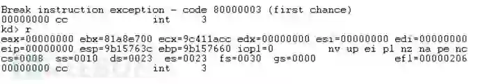 如果我们将这段代码添加到一个DLL中,并将其注入到NTVDM进程中,我们发现WinDBG会触发以下断点: