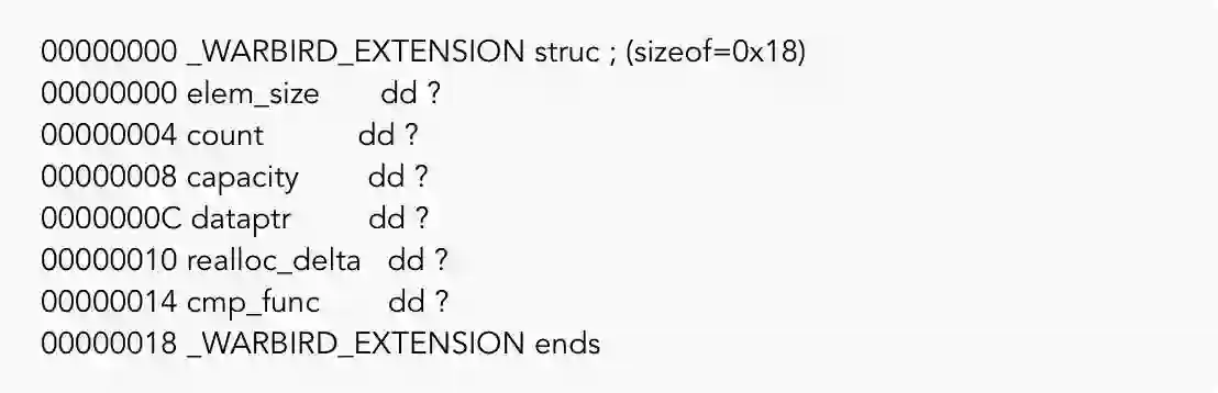在这里,dword ptr [ebx+14h]调用实际上是调用上述结构中的cmp_func属性,这意味着在进入shellcode时,ebx寄存器指向_WARBIRD_EXTENSION结构。