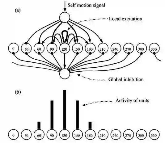 连续吸引网络(CANs)是一种神经网络,可以用来模拟位置单元、头部方向单元和网格单元的行为。 (a)显示出了用于模拟头部方向单元的CAN的示例,每个细胞激发自身和附近的单位(见本地激发箭头),并抑制其他细胞。 (b)显示了一个以局部激发和全局抑制相结合产生的以120°为中心的稳定活动包来自动作输入的输入。
