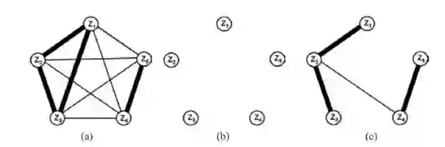 图8:FAB-MAP学习词汇外观与地点识别之间关系的概率模型。 (a)完全联合分配考虑词之间的关系(词之间的粗线代表具有最大相互信息的那些词)(b)完全联合分布的朴素贝叶斯近似忽略了单词之间的互信息,并假设所有单词都是独立出现的 (c)Chow-Liu树近似完全联合分布作为联结树,每个词只取决于另一个词