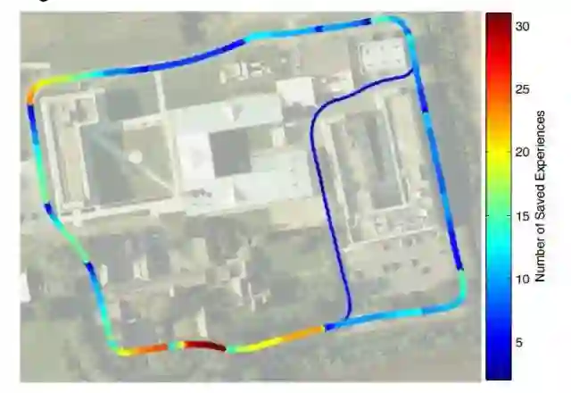图10. 变化环境的变化外观需要系统存储每个地点的多个表达。此图展现了在一个月的反复遍历同一路径后,存储的机器人的“经历”的数量。大多数地点需要5-10次经历(蓝色),而有一些需要30次以上(红色)。