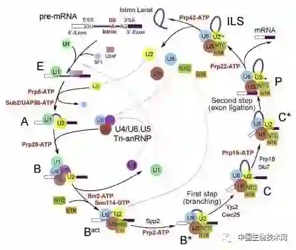 RNA剪接这一复杂的生理过程由剪接体(spliceosome)来执行。剪接体是细胞中已知的最为复杂的大分子机器,分子量巨大并且高度动态,主要由蛋白质-核酸形成的复合物(ribonucleoprotein,RNP)组装形成,它在前体信使RNA(pre-mRNA)上完成识别、组装、激活、催化等一系列过程,并最终在反应结束后解离成许多小的功能单元,以进入下一个反应循环。根据剪接体的组成与构象的不同,可以将剪接体分为E、A、B、Bact、B*、C、C*、P、ILS等若干状态(图1)。