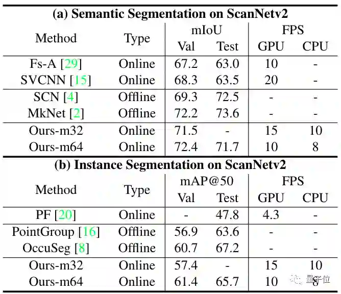 和其他方法对比,在ScanNetv2数据集中,语义分割任务下INS-Conv的均交并比(mIoU)结果优于其他两种实时方法。