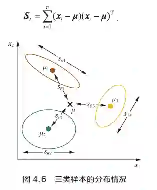 回顾两个散度矩阵, 类内散度矩阵在类别增加至N 时仍满足定义, 而之前两类问题的类间散度矩阵在类别增加后就无法按照原始定义。图4.6 是三类样本的分布情况,其中分别表示棕绿黄三类样本的中心,μ 表示这三个中心的均值(也即全部样本的中心),Swi 表示第i 类的类内散度。我们可以定义一个新的矩阵St,来表示全局整体的散度,称为全局散度矩阵