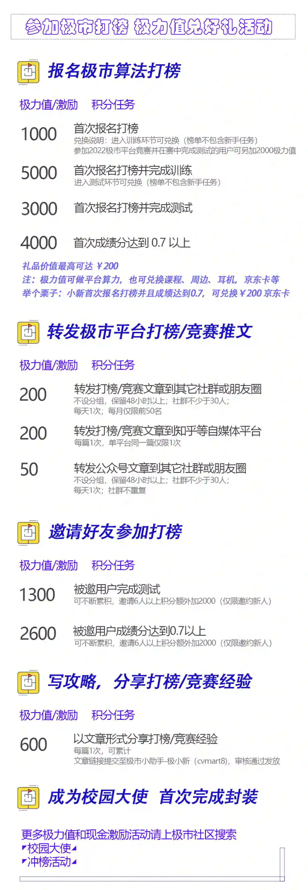 转发本活动推文或极市平台最新竞赛/打榜相关推文至社群/朋友圈、自媒体平台,并将分享截图或链接提交到极市平台小助手-极小新(cvmart8)进行登记,审核通过即可获得相应极力值。