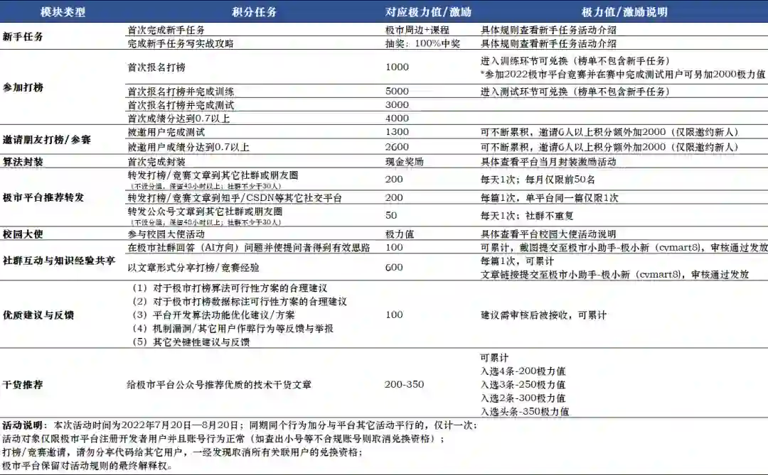 成为极市平台用户,首次报名打榜即可领取极力值!首次报名打榜、完成训练、测试,完成打榜不同环节分别能领取相应极力值!2022年报名参加极市平台竞赛活动的朋友,报名打榜并完成训练还可额外领取2000极力值。
