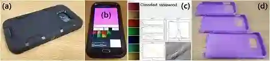 在下图中,(a) 表示智能手机正面朝下放置在物体表面上,而屏幕发出不同颜色的光线,摄像头捕捉反射光线的图像。(b) 表示手机的UI,展示主要的光源和捕捉到的图像。 (c) 分类服务器的UI,顶部显示接收到的图像和分类结果,提取到的特征(颜色柱状图、梯度变化曲线)。 (d) 用于案例研究的不同长度的手机壳。