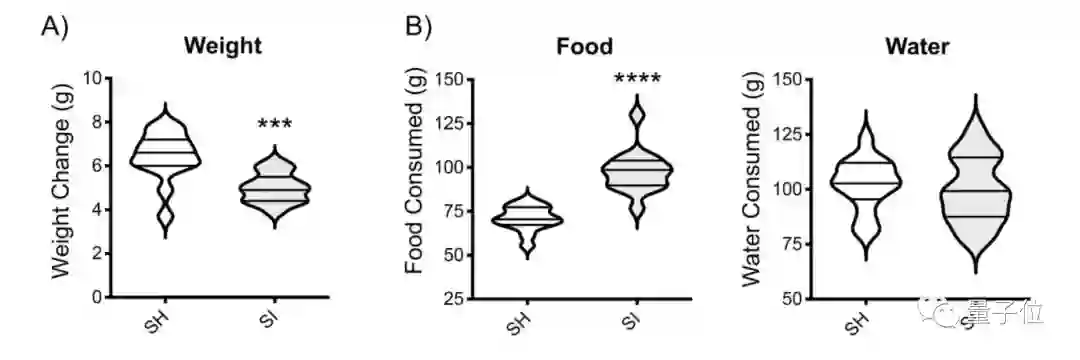 但在食物和水的消耗上,独居小鼠的平均食物消耗量反而比群居小鼠多了约37%,平均耗水量大致相同。