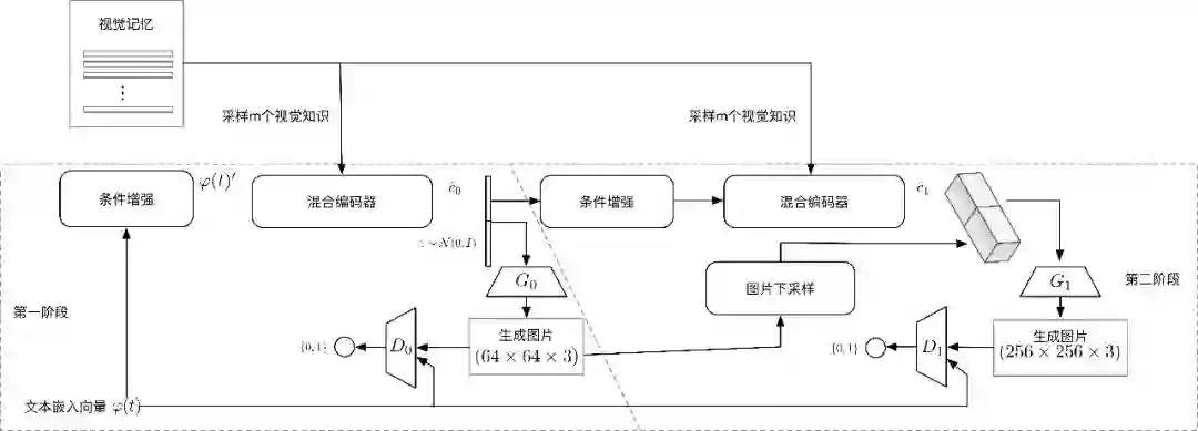 因此,文献[62]使用图像子块作为视觉提示来增强文本到图像的生成。具体来说,文献[62]使用候选区域网络(Region Proposal Network, RPN[63])提取的候选块(proposal)作为存储在外部视觉知识存储器中的视觉线索。候选块特征向量可以被视为有意义的图像子块的视觉概要,尤其是那些包含实际物体概率最高的图像子块。RPN提取的候选块(即视觉线索)具有许多视觉细节,例如纹理,形状,颜色,物体大小等,它们可以被文本激活,并和文本描述一起合成最终的图像。