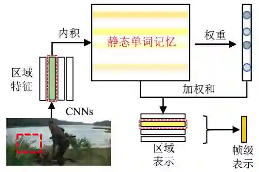 文献[51]提出的静态单词记忆有两个特点:(1)静态单词记忆可以看做是一个单词嵌入矩阵,我们可以利用记忆将单词映射为连续向量;(2)静态单词记忆可以用于表示电影帧中的区域特征。