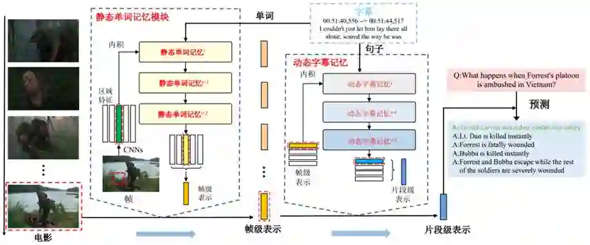 嵌入得到。需要注意的是静态单词记忆在表示电影视频帧的区域特征、句子中的单词时是共享的。每个电影的字幕记忆都不相同。因此单词记忆是静态的,字幕记忆是动态的。同时上面所提到的静态单词记忆和动态字幕记忆都只有一个记忆层。