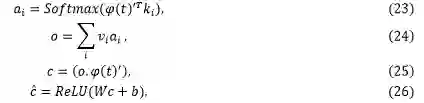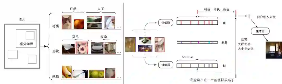 的维度为d。键表示用于参与和加权检索出来的知识。值表示包含生成图片时的指示。键和值编码器都是神经网络,它们是简单的完全连接层加上ReLU激活函数。多模态隐向量的生成如公式(23)-(26)所示。