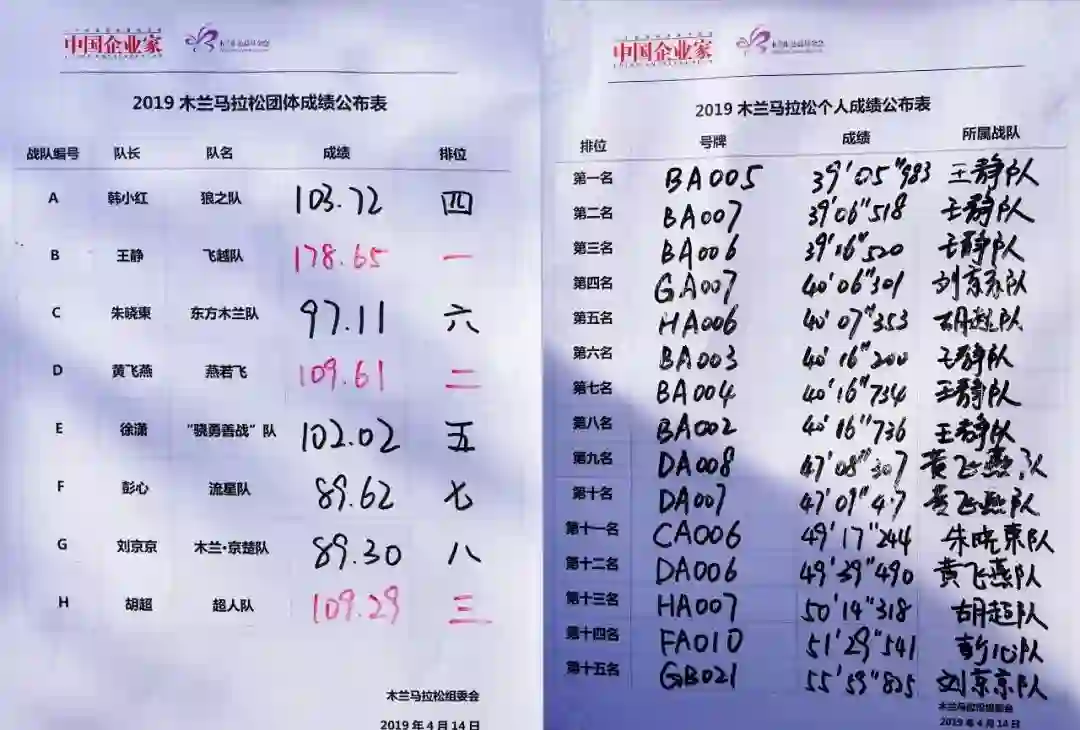 最终,王静队、黄飞燕队、胡超队获得了首届木兰马拉松团队冠军、亚军、季军(图片由上至下)。