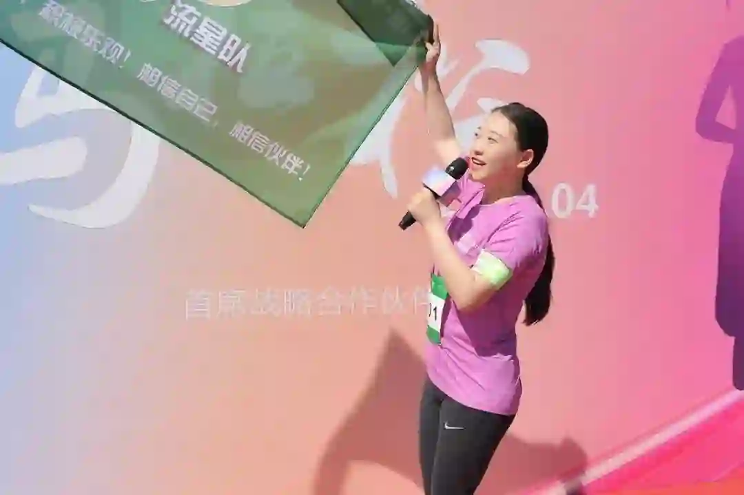 本届木兰马拉松的荣誉队长韩小红向胜利招手。