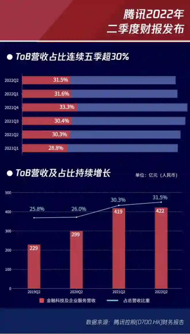 前不久,腾讯发布2022年第二季度业绩报告,其中“金融科技及企业服务”单季收入422亿元,占总营收31.5%,连续五个季度超过30%。