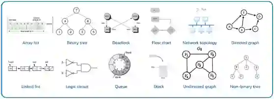 示意图明确表达某个特定主题或概念,传递可推理的规则或逻辑信息,使用抽象的图形化符号而不是真实图片来呈现元素的一种表示。相比自然图像,示意图不包含阴影、纹理、背景等,视觉要素表达更加凝练简洁,包含丰富的信息。根据构成要素,示意图可划分为两类。已有研究主要集中于第一类:来自生物学、地理学等自然学科示意图,其对象主要由抽象化的动物、植物等事物构成,表达方式与自然图类似。本数据集聚焦于第二类:几何图形类示意图,其对象主要由圆形、矩形、箭头等符号组成,如图1所示。该类示意图抽象化程度更高,对象表达方式多样,包含复杂的逻辑结构,例如二叉树中根节点与叶节点间具有父子拓扑关系。理解该类示意图具有极大挑战,也是实现智慧教育等应用的重要基础。