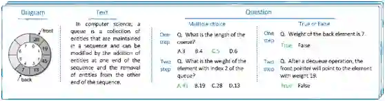 示意图问答任务是指:计算机在给定一张示意图和相关的知识文本内容下回答自然语言问题。在数据集中,知识文本是以是示意图类别为关键字爬取的维基百科相关信息。我们共设计了两种难度的问题。简单问题:计算机仅需要一次推理即可给出答案;复杂问题:计算机需要两次推理才能给出答案,在所有标注问题中,复杂问题所占比为22.98%。形式上,标注的问题还可划分为四选一问题和判断题,示例如图3所示。