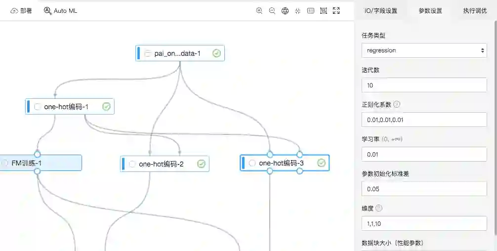 One-hot编码可以将字符型数据转成数值型表示,在FM-Embedding方案中首先利用“onehot编码-1”针对全量数据进行编码,生成编码模型再输入到“onehot编码-2”和“onehot编码-3”中,“onehot编码-2”需要选择User对应的特征信息进行编码,“onehot编码-3”选择Item对应的特征信息进行编码。