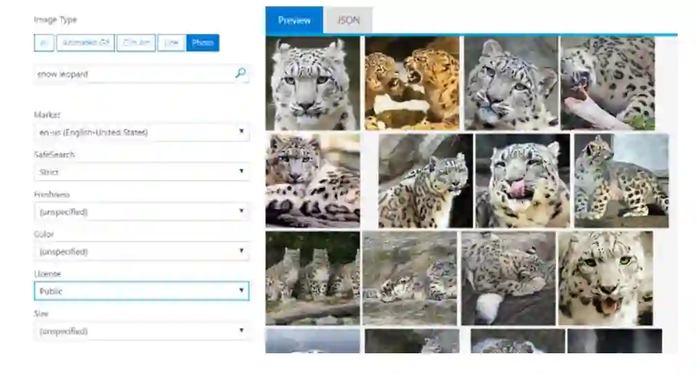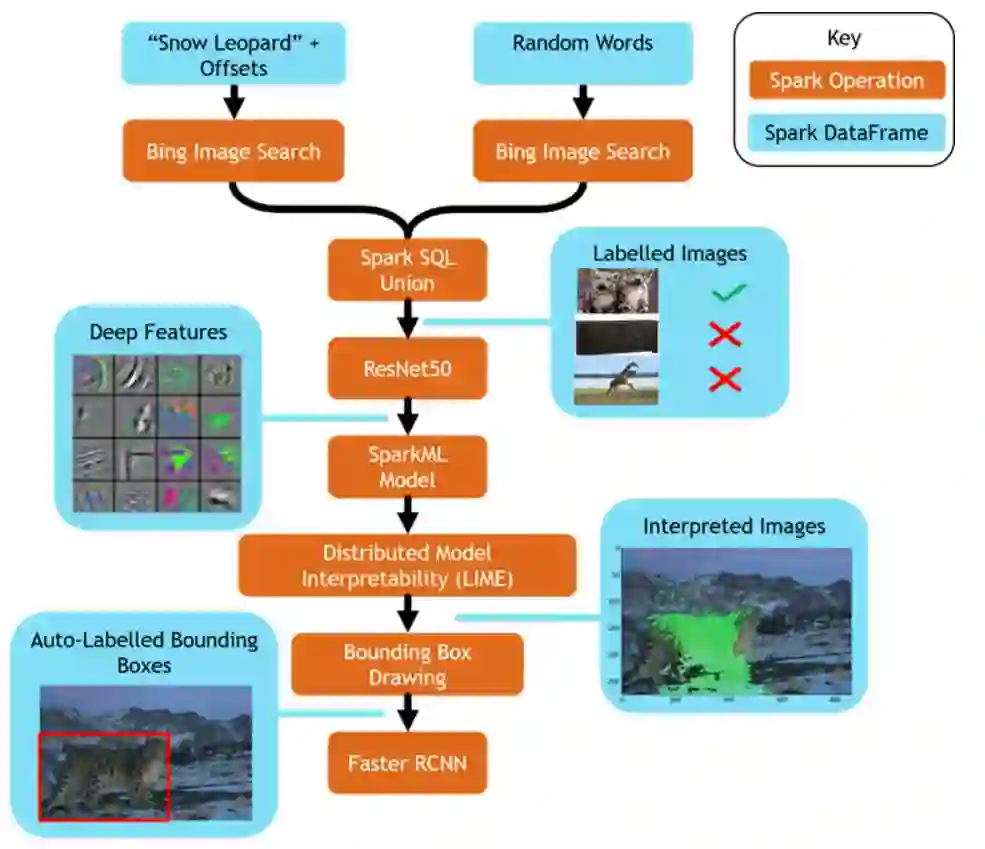 基于 Bing 图片搜索结果的数据集,可以在 Spark 上创建各种应用。以收集雪豹数据集为例,只需要两个 Spark 查询就可以完成数据集收集,其中一个查询收集正样本(雪豹相关的图片),另外一个查询收集负样本(随机图片)。然后,将结果数据集拉取到 Spark 集群,通过 Spark SQL 做预处理,比如:添加标签、删除重复数据等。Spark 在 Azure 集群上并行处理,只需要花费几秒钟的时间就可以通过 Bing 搜索获取到世界各地的上千张图片。然后,通过 MMLSpark 的 OpenCV on Spark 对图片进行快速处理。