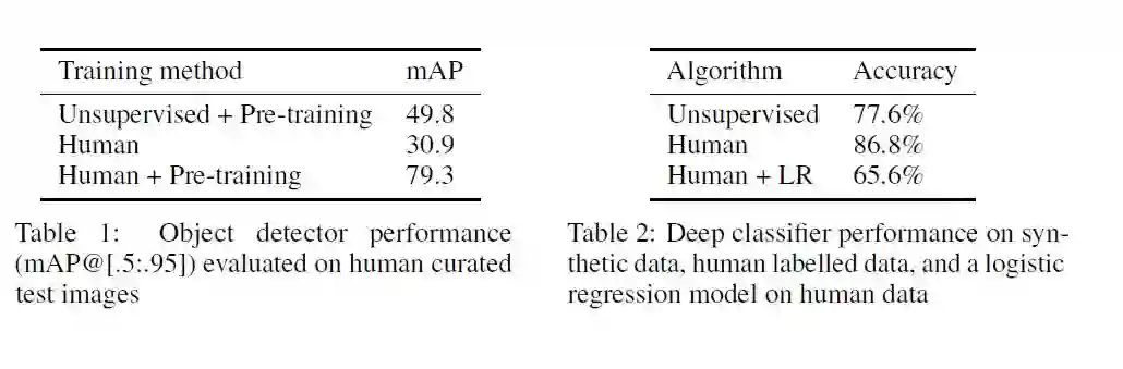 我们发现大多数的图像我们完全无监督的目标检测器绘制的边界框非常接近人类绘制的水平。下图表 1 和表 2 表明,我们的方法可以逼近人类的分类效果和人类的物体识别能力。在物体检测方面,无监督 + 预训练模型的 mAP 值达到 49.8,超过了人类的 30.9,小于人类 + 预训练模型的 mAP 值 79.3。图像分类方面,无监督的精确率为 77.6%,比人类的 86.8% 低,但是,高于人类 +LR(逻辑回归) 的精确率 65.6%。