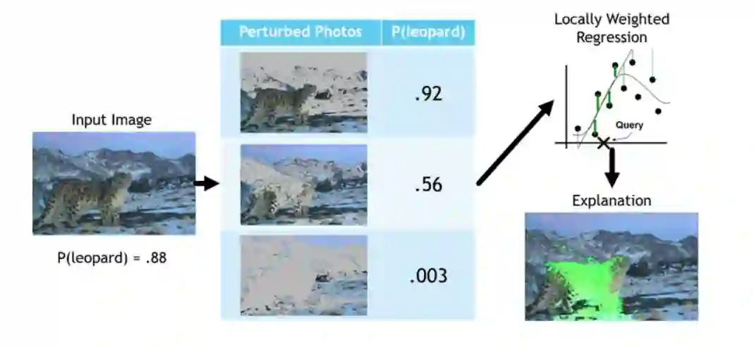 以图像分类为例,局部遮挡会影响模型的最终输出,那么则说明遮挡的这一部分对分类结果非常关键。更正式地说,通过将图像随机块或将”超级像素“设置为中性颜色来创造大量扰动的图像,然后,将这些扰动的图像灌注给模型,从而观察其如何影响模型的输出。 最后,使用局部加权 Lasso 模型来学习超像素“状态”的布尔向量与模型输出结果之间的映射关系。