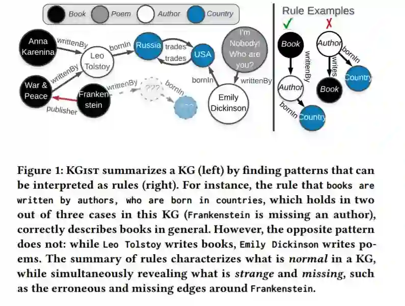 这个工作,我们引入了一个统一的解决方案来描述KG的特性,通过用一组归纳的软规则将问题化为无监督的KG总结,这些规则描述了KG中的正常值,从而可以用来识别异常值,不管是奇怪的还是缺失的。与一阶逻辑规则不同,我们的规则被标记为有根图,即根据节点的类型和KG中的信息,描述一个(可见或不可见的)节点周围的预期邻域的模式。在传统的基于支持/信任的规则挖掘技术的基础上,我们提出了KGist,即知识图谱归纳摘要,它学习归纳规则的摘要,根据最小描述长度原则对KG进行最佳压缩——这是我们在KG规则挖掘上下文中首次使用的公式。我们将规则应用于三个大型KGs (NELL、DBpedia和Yago),以及诸如压缩、各种类型的错误检测和不完整信息标识等任务。我们证明了KGist在错误检测和不完全性识别(识别93%缺失实体的位置—比基线多10%)方面优于特定于任务的、有监督的和无监督的基线,同时对于大型知识图谱也是有效的。