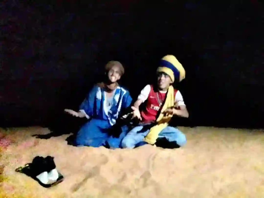 此时,沙漠已不再是想象中的远方。厨房有专门的帐篷,几个柏柏人在里面忙碌一晚,端出炖鸡和茄子搭配的塔基锅,毫不简陋,在沙漠中甚至过于丰盛。这些原来在沙漠中游牧的柏柏人卷入成为沙漠旅游产业链上最基层的一环后,在旺季从事用自家骆驼把游客从旅馆载入沙漠营地的工作,淡季则回到沙漠中游牧,放羊和骆驼。他们实际上不是擅长歌舞的民族,却按照一种对少数民族文化的想象,在晚饭后安排了篝火晚会。
