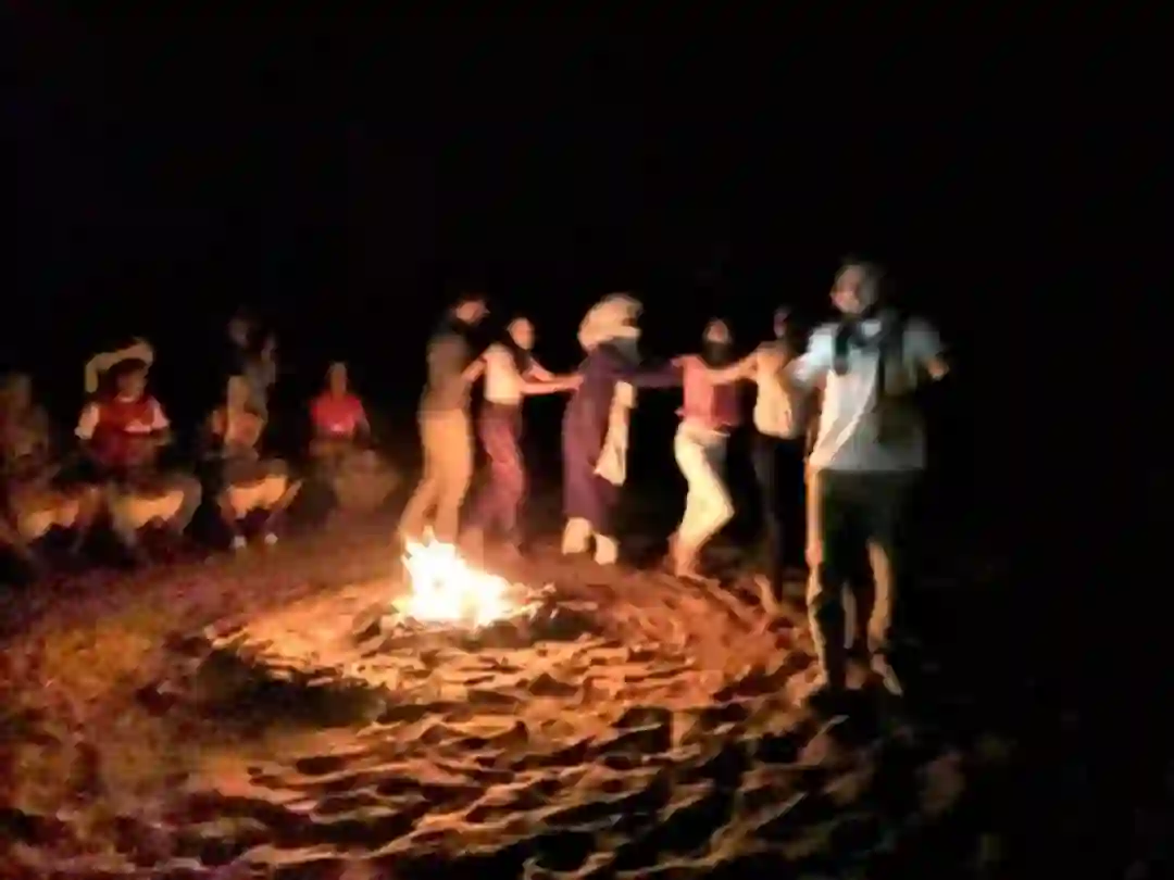 在厨房中忙完的柏柏人,坐到沙坑里点燃的篝火边,用一段节奏循环重复的鼓点,召唤饭毕的游客围过去。另几位柏柏人开始加入拍掌和歌唱,节奏立即完全走型,与鼓点混杂成凌乱不成调的“二重奏”。领头的柏柏人不太会跳舞,大家很快发现,无法跟上他节拍与动作都轮廓模糊的无章法动作。游客们自己跳了起来:先是配合着一位美国人的动作围成顺时针移动的一圈——每个人都熟悉这种公司或组织机构增进情感的bonding活动上常用的姿势;然后在一位德国人的带领下手拉手齐步踢左腿右腿,像一种健身操的变体。