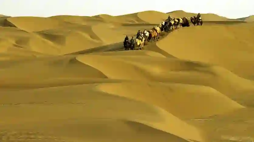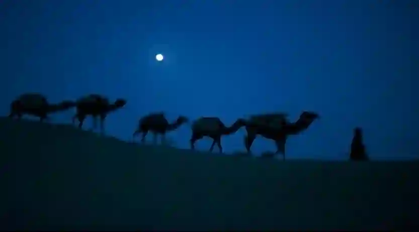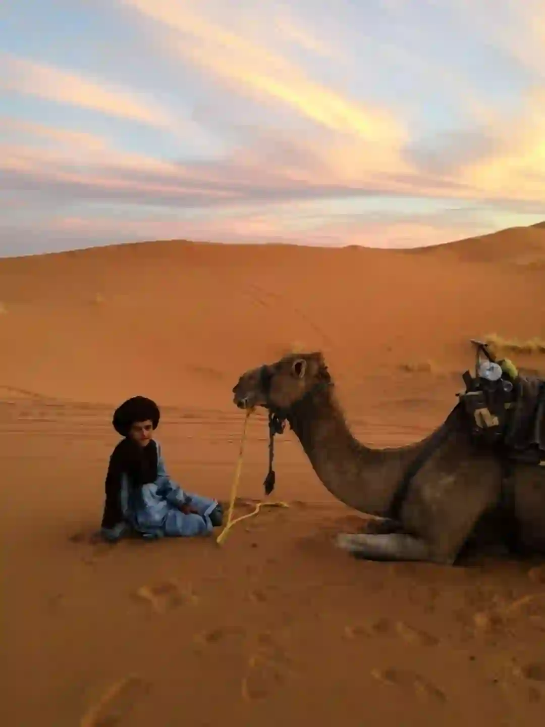在帐篷里,两位旅行者回了回神。到达营地前,他们好歹在单峰骆驼背上经历了几个小时漫天黄沙中的跋涉。这些骆驼的驼峰上都掌了驼鞍,人就骑在垫得平如高原坝子的峰顶处,骆驼每次起身或趴下,都能在一阵微小的颠簸和失重中感受它的峰值高度。